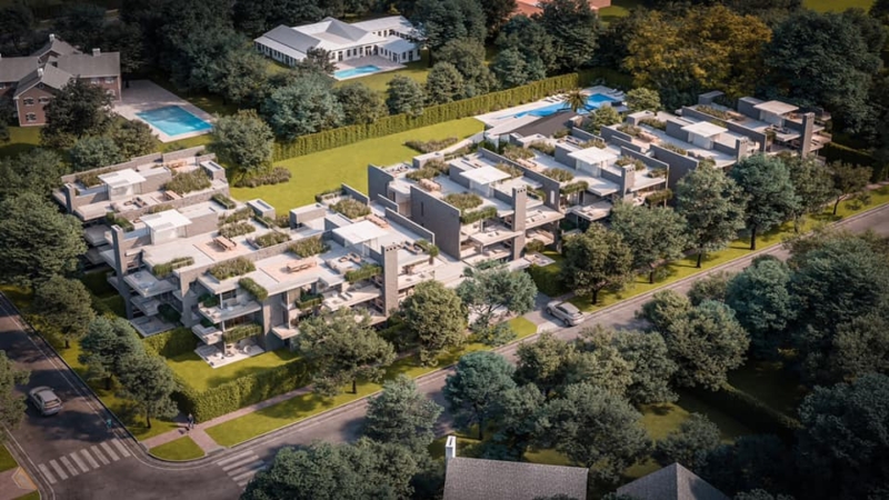Con unidades armonizando en medio de bosques y un parque central diseñados por Fuster, el proyecto involucra además una millonaria inversión en obra pública sobre su entorno.