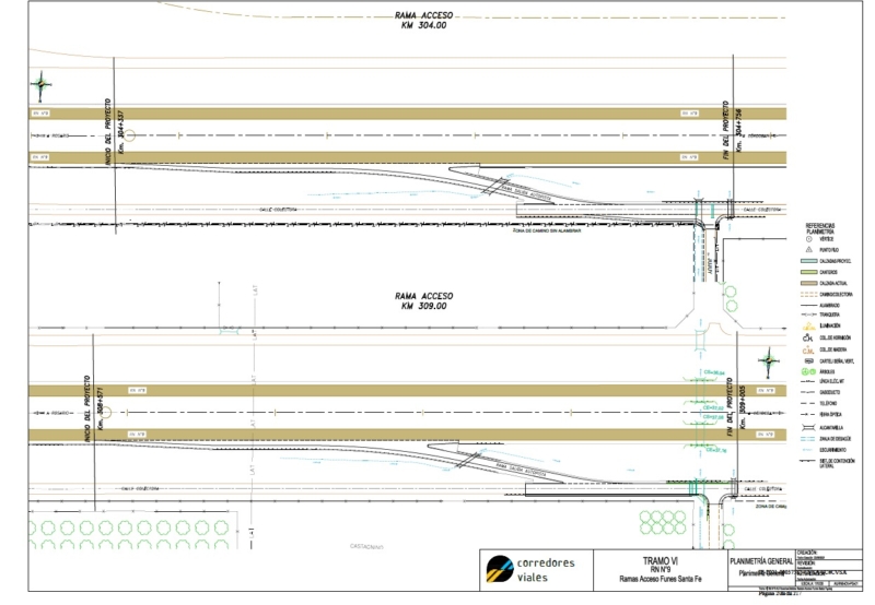 En relación a la colectora sur y ramas de ingreso y salida, se prevé ejecutar la prolongación de la colectora actualmente de suelo para poder materializar la rama de ingreso descendente ubicada a aprox. 450m de la intersección hacia el sureste. Se prevé la ejecución de la rama de salida ascendente ubicada aproximadamente a 850m antes de la intersección en cuestión, hacia la colectora norte pavimentada existente.