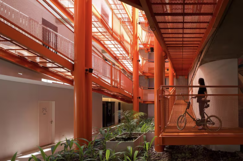 Apuntando a condominios dominados por gente joven, el proyecto ubicado en Donado-Holmberg tiene una rampa color naranja para bicicletas y permite ingresar hasta cada una de las unidades pedaleando desde la calle.