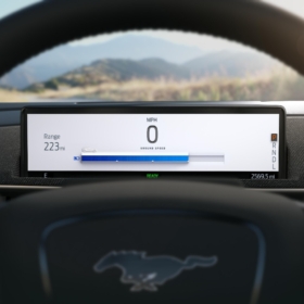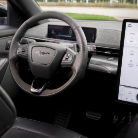 El ADN Mustang está presente en el diseño del nuevo Mach-E: el capot alargado, el pilar C adelantado, la “nariz” de tiburón, las cejas rectas, la amplia distancia entre ejes, faros traseros con las tres barras verticales con luz LED características y una caída de techo tipo “fastback”, son pruebas inequívocas de la familia Mustang, reinterpretadas esta vez en un crossover deportivo.