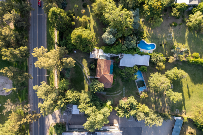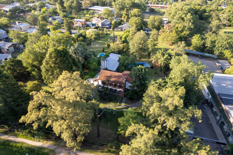 El terreno se caracteriza por su amplia fachada de 36 metros lineales de frente y una profundidad de 130 metros. En su interior, se encuentran dos construcciones principales que suman alrededor de 700 metros cuadrados de área cubierta, acompañadas de espacios verdes significativos con su propia arboleda y una piscina.