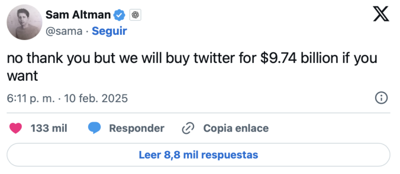 El director general de OpenAI, Sam Altman, rechazó rápidamente la oferta en X, la plataforma social de Musk, diciendo: “no, gracias, pero compraremos Twitter por 9,74 mil millones de dólares si quieres”. Musk adquirió Twitter, ahora llamado X, por 44 mil millones de dólares en 2022.