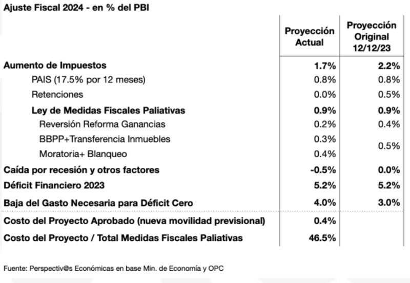 El costo fiscal de la iniciativa, según cálculos del Oficina de Presupuesto del Congreso (OPC) sería de 0.4% del PBI. Algunos diputados en defensa del proyecto argumentaron que se trataba de una cifra ínfima, tratándose de que el objetivo es mejorar la situación de los adultos mayores. Sin embargo, la cifra no es ínfima, todo lo contrario. Tal como puede verse en la tabla, 0.4% del PBI es lo que esperaba recaudar el Gobierno de la reversión del impuesto a las ganancias a las personas humanas cuando presentó su programa a fines de 2023. Ahora esa cifra se redujo a la mitad. Así que estamos hablando de dos veces la reversión de ganancias; o, alternativamente, el 0.4% equivale al 46.5% de lo que el Gobierno espera recaudar producto de la ley de Medidas Fiscales Paliativas.