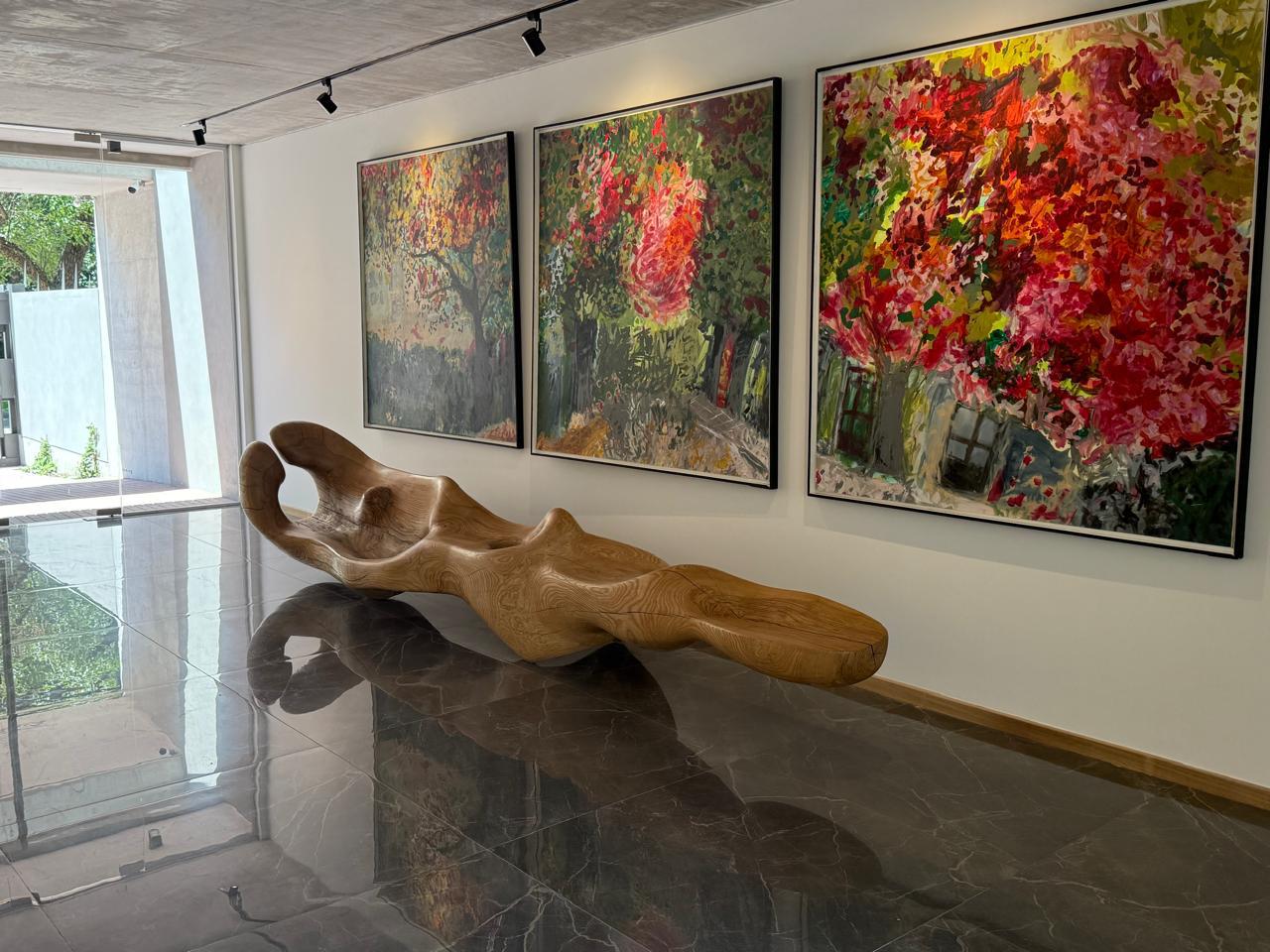 El hall de ingreso marca el primer impacto visual con tres obras pictóricas de Marcela Duluc recreando paisajes de Fisherton. Al pie un banco tallado en madera por el artista Maximiliano Rodríguez, completa la primera escenografía del lugar. “El banco fue esculpido a partir del tronco de un fresno enfermo. Su forma emula un banco que vi en el Malba, lo fotografié y viajamos hasta Rincón, donde tiene su taller Maximiliano”, comenta Gabriel Perez.