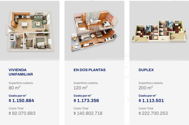 Vivienda de 80 m2 unifamiliar: cuesta $1.150.884.- por M2, se discrimina $519.888.- por mano de obra y $526.370.- por materiales. Costo total de la casa: $92.070.683.-