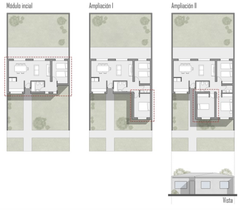 El módulo inicial y las ampliaciones sobre las que se efectuó el correspondiente cómputo para luego realizar el presupuesto responde a uno de los esquemas para viviendas publicados por el Banco Hipotecario dentro del anterior plan de financiamiento para autoconstrucción Procrear. Se trata de un módulo inicial mínimo de 51 m2., compuesto de un estar comedor, cocina, baño y dormitorio y la alternativa de una primera ampliación sumando otro dormitorio, un baño adicional y una segunda ampliación en la que se completaría la vivienda consistente en un tercer dormitorio, bajo el supuesto de una localización suburbana del GBA, provista de infraestructura de gas natural, agua corriente, cloacas y electricidad.