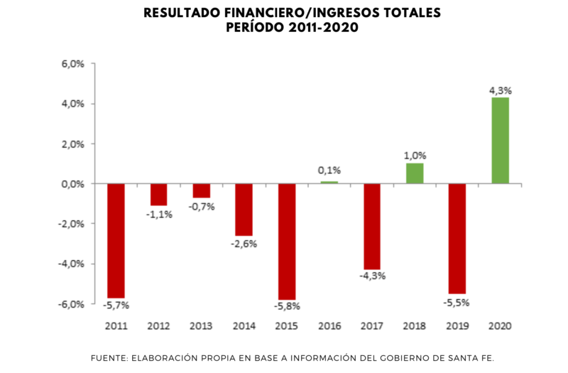 Respecto a la evolución del resultado financiero para el período 2011-2020, únicamente en tres años (2016, 2018 y 2020) hubo resultados financieros positivos, en tanto que la relación con los ingresos totales arroja el más bajo desempeño en 2015 con un -5,8%. El mejor resultado de la serie, se obtuvo para el año 2020 con un ahorro equivalente al 4,3% de los ingresos provinciales.