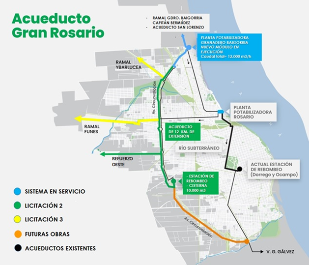 La obra que beneficiará a más de 550 mil habitantes de la región, se alimenta desde la Planta Potabilizadora ubicada en Av. de Circunvalación y ruta 11, de Rosario.
