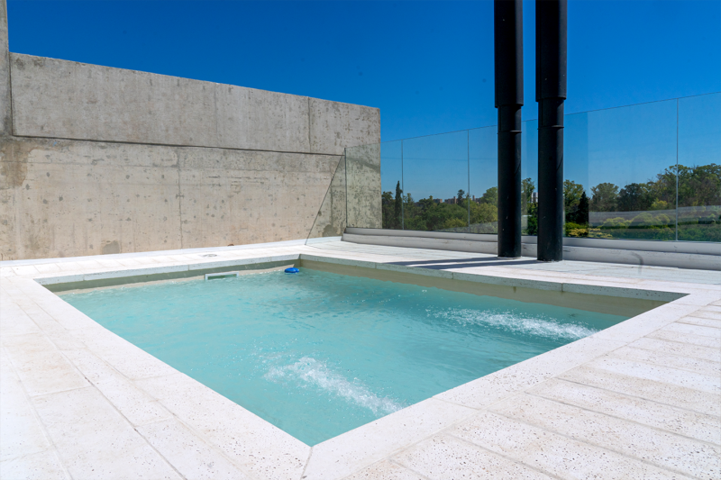Uno de los ítems más destacados del proyecto es su terraza verde: a diferencia de lo que suele suceder en la mayoría de los proyectos inmobiliarios, en la parte alta del edificio hay un solárium con césped 100% natural. En ese espacio, además, hay una piscina con climatización solar y un quincho equipado con parrilla.