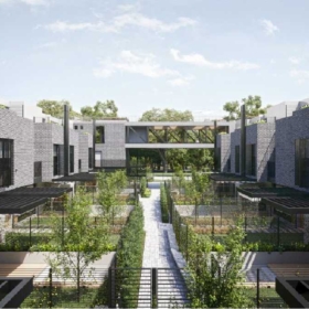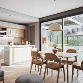 El proyecto residencial de vanguardia está en el corazón de Fisherton, frente la plaza Vicente López, muy próximo a la icónica parroquia Cristo Rey.