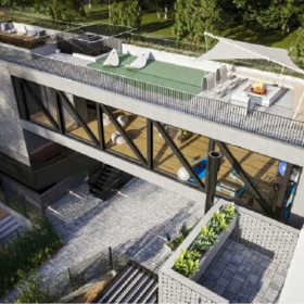 Además de las residencias, el desarrollo cuenta con un local comercial, preferentemente para un emprendimiento gastronómico y cocheras subterráneas para más de un vehículo por propiedad.
