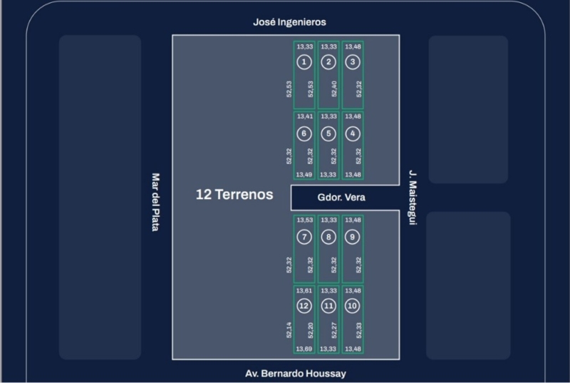 El primero de estos desarrollos se ubica en el sector delimitado por las calles Maiztegui, Houssay, José Ingenieros y Mar del Plata. Se trata de una parcela de 12 lotes de 700 metros cuadrados cada uno, listos para tomar posesión, y con los servicios de electricidad, gas natural y alumbrado público.