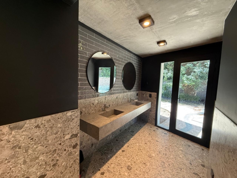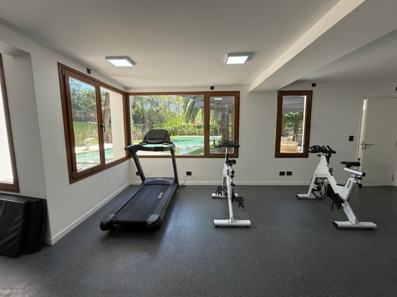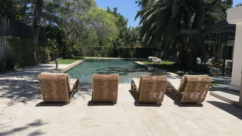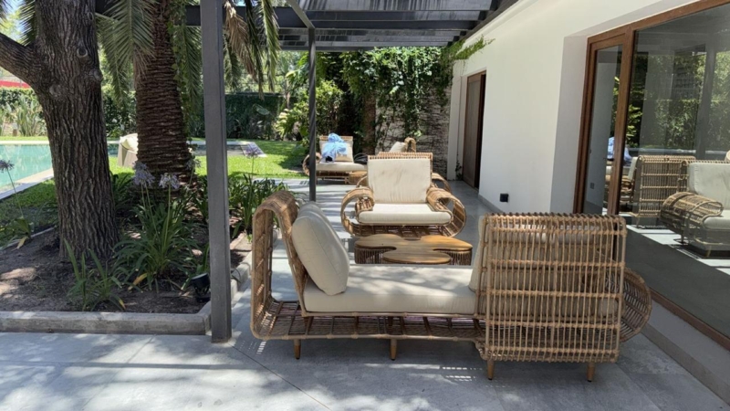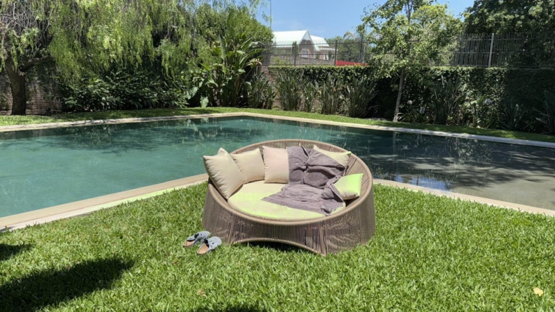 La galería trasera, con vista a la pileta, invita a la contemplación desde las poltronas italianas escogidas por los interioristas junto al resto del mobiliario. “Fuimos muy consecuentes con la idea de recrear diferentes espacios de intimidad. Por eso la piscina se esconde detrás de la casona, la vegetación de diferentes alturas y texturas abunda en cada sitio. Todos los amenities son muy habitables y generan tanto puntos de encuentro como de reflexión”.