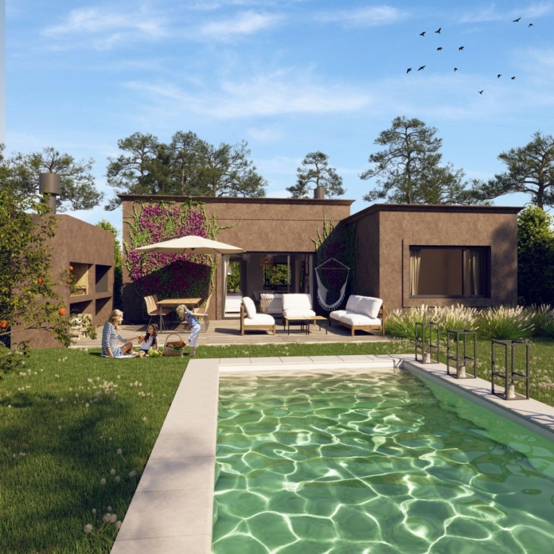 Las unidades se entregan además con equipamiento completo de cocina y placares, pre-Instalación de aire acondicionado, estufa de alto rendimiento con posibilidad de calefacción central. La casa cuenta además con iluminación inteligente con pre-instalación de domótica”.