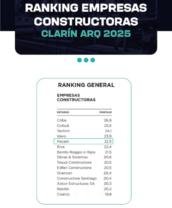 El prestigioso ranking de Clarín ARQ 2025 ubicó a Grupo Pecam, desarrolladora rosarina, en el selecto grupo de las principales constructoras de la Argentina. Con un puntaje de 22,5, la firma quedó en el quinto lugar a nivel nacional, por delante de referentes históricos como Riva, Benito Roggio e Hijos y Obras & Sistemas.