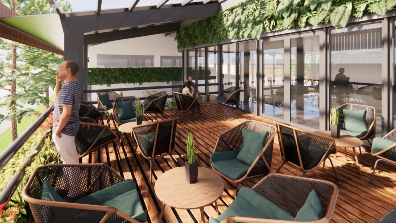 La galería imagina allí una propuesta gastronómica que acompañe la vida cotidiana del lugar: desayunos, almuerzos frescos, un ambiente descontracturado y cómodo para trabajar un rato, reunirse o relajarse después del gimnasio o las clases de danza.
