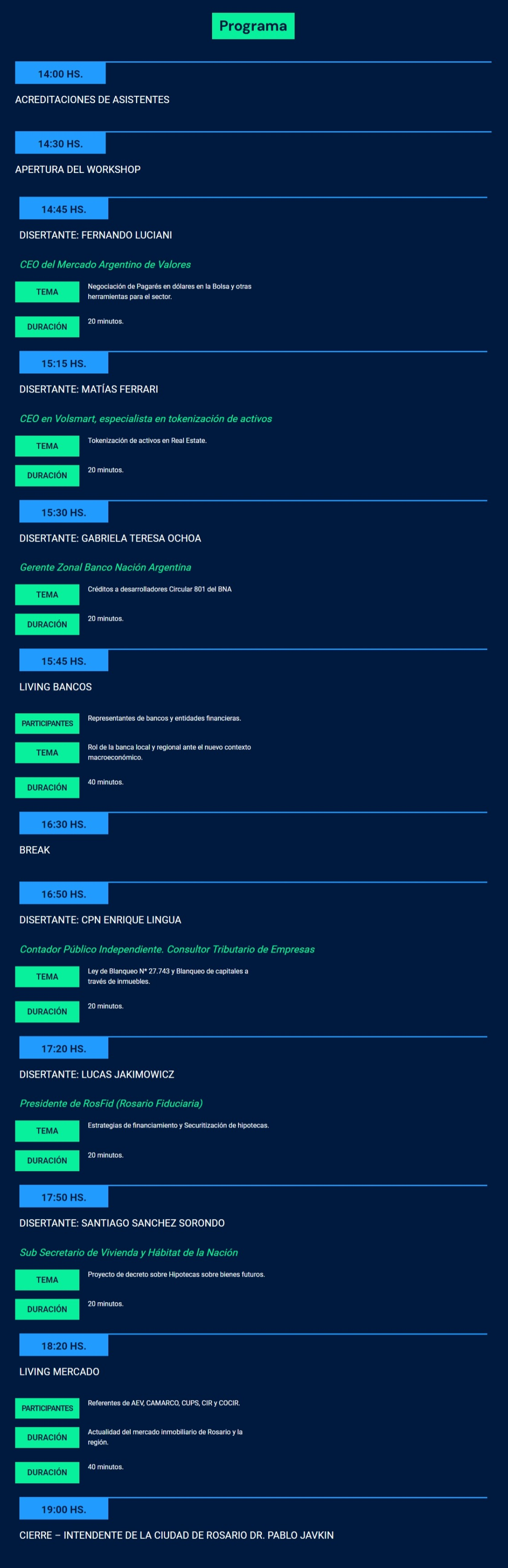 Este programa se dividirá en dos tramos que contarán con seis charlas de especialistas y dos livings de opinión. Estos últimos serán sobre rol de la banca en el financiamiento del sector y el último estará integrado por protagonistas de la comunidad de desarrolladores, constructores y operadores inmobiliarios de la región.