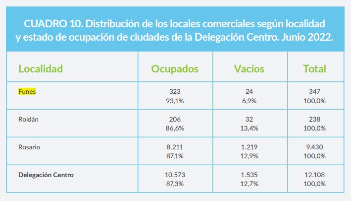 El trabajo se construyó en base a un barrido territorial por las cabeceras departamentales y las localidades de Funes y Roldán. Según el mismo, la ocupación en la ciudad alcanza el 93,1%, sobre un total de 323 edificios comerciales relevados.