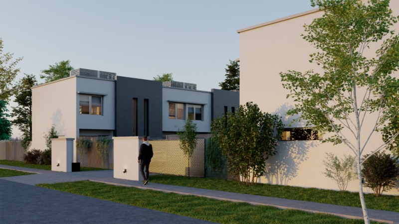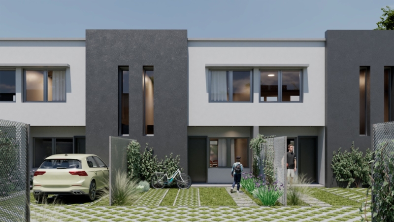 Cada dúplex tendrá dos plantas y 82 m² cubiertos, con dos dormitorios, baño principal y toilette, living-comedor, pequeños patios delantero y trasero con parrillero y pileta, y cochera independiente.