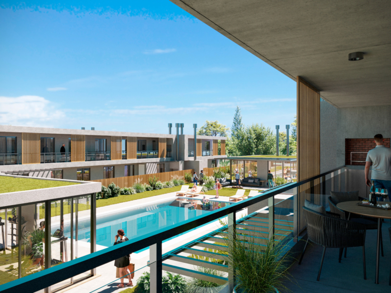 Las residencias se plantean en tipologías de uno, dos y tres dormitorios con cocheras y bauleras para todos los departamentos. Siendo los de la planta baja los de mayor superficie, contando además con un patio interior. El área de viviendas se completa con un gran parque central donde se ubica una piscina con solárium, un gimnasio y el sector de quinchos.