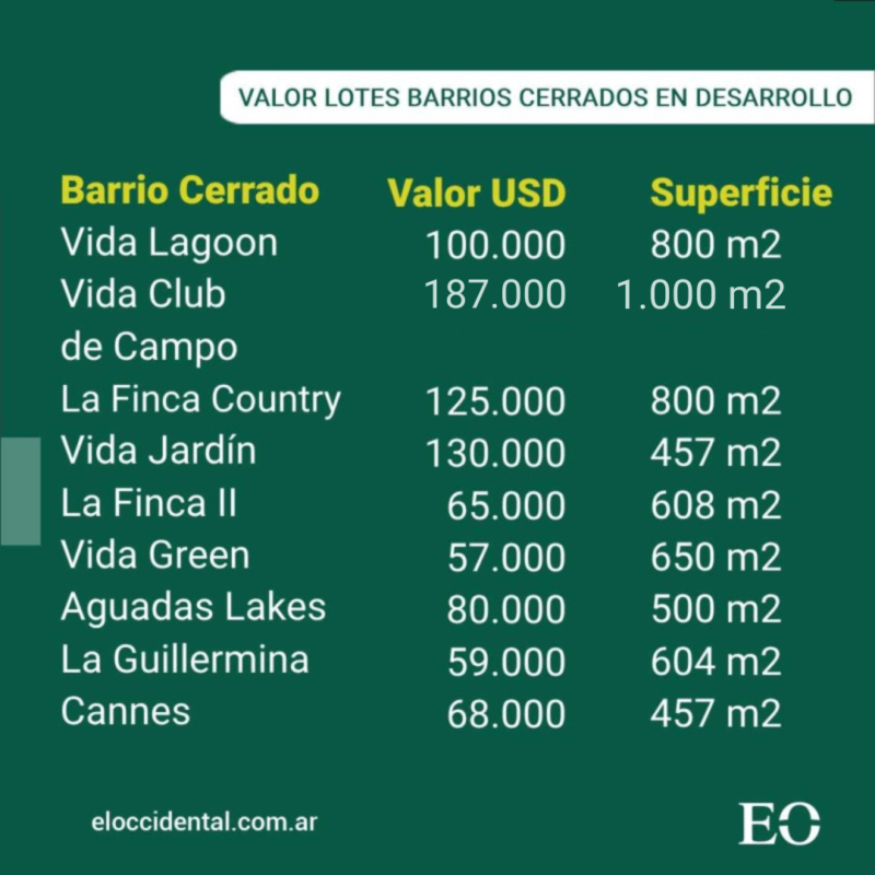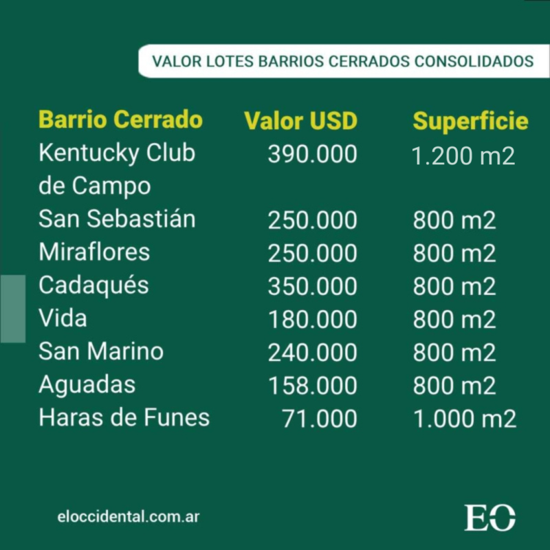 Si bien todos los barrios cerrados ofrecen unidades de diferentes superficies, fueron seleccionados los lotes de 800 m2 (superficie estándar) a los fines comparativos. Siendo la excepción Haras de Funes con terrenos de 1.000 m2 y en el otro extremo Cannes, Aguadas Lake, La Guillermina, Vida Green y La Finca II con terrenos que van entre los 450 m2 a los 650 m2.