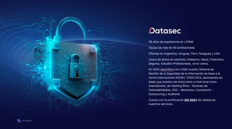 Datasec, con 36 años de sólida experiencia en LATAM, cuenta con un equipo de más de 40 profesionales distribuidos en oficinas estratégicas en Argentina, Uruguay, Perú, Paraguay y USA. Su exitoso historial incluye casos destacados en sectores como Gobierno, Salud, Puertos, Financiero, Firmas de Servicios Profesionales y diversos ámbitos.