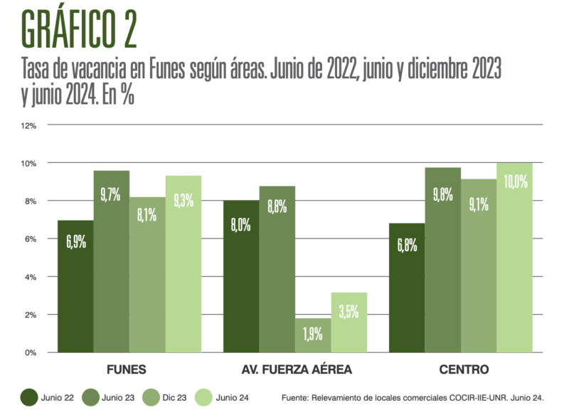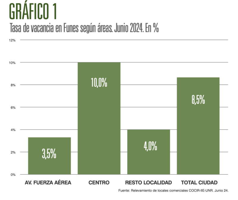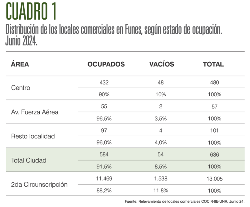 Iniciando el análisis en Funes, el estudio realizado por Cocir y la UNR arroja que en la ciudad hay un total de 636 locales comerciales concentrados principalmente en el casco histórico de la ciudad con 480 locales, aglutinando la Av Fuerza Aérea 57 locales y las unidades restantes atomizadas en el resto del territorio funense.