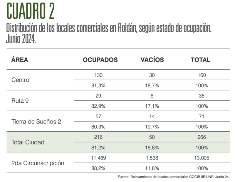 En la ciudad de Roldán, se relevaron un total de 266 locales comerciales en junio de 2024, de los cuales el 81,2% están ocupados mientras que el 18,8% restante se encuentran vacíos, registrando así una tasa de vacancia superior a la registrada en Funes.
