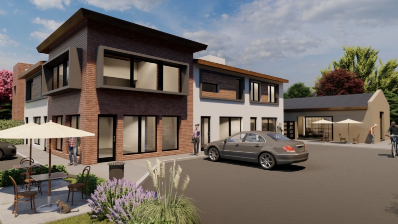 La iniciativa cuenta con cuatro locales comerciales de amplias dimensiones (36 m², 32,97 m², 28,18 m², 25,78 m²), dispuestos en forma de “L” en la esquina sobre Planta Baja conformando un basamento o zócalo de uso comercial a modo de paseo.