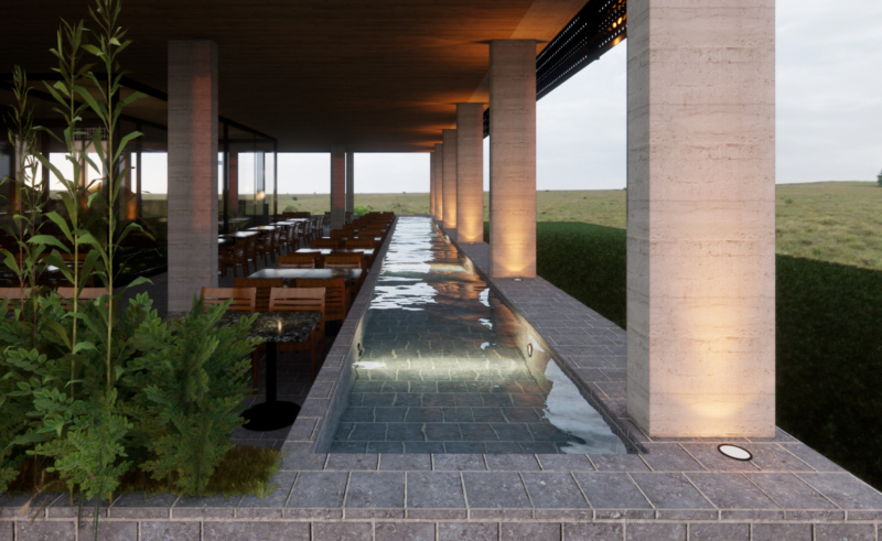 Rock&Feller’s ocupa la planta baja del complejo en un espacio de 30 metros de frente por 70 de fondo, donde la arquitectura propone una narrativa que combina la memoria local con el lenguaje de marca. La materialidad rústica —muros en símil piedra negra molida, pisos de piedra y entablonados— responde a la historia reciente del lugar, marcado durante décadas por fincas y casas de fin de semana antes de la transformación comercial del corredor.
