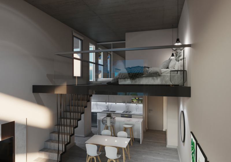 Domina la segunda planta unidades “estudio loft» con entrepiso que puede jugar la doble función de residencia y espacio de trabajo, muy funcional a profesionales.