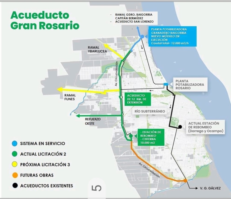 Si bien los anuncios simplificados de la dirigencia política hablan del ducto que fue licitado en noviembre del 2022, en rigor, para efectivizar el suministro de agua a las citadas localidades se requiere de dos obras previas fundamentales: la ampliación de la planta potabilizadora de Granadero Baigorria y la obra de conducción que lleva el fluido hasta la cisterna de Provincias Unidas y avenida Circunvalación. Permitiendo luego el rebombeo para toda la zona oeste de Rosario, donde entra en juego la tercera etapa con la construcción de los tan anunciados “ramales Funes-Ibarlucea”.