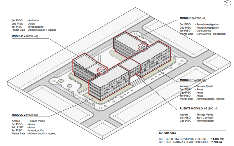 Pese a que el diseño data de hace cuatro años y a que el Polo Educativo-Tecnológico todavía no estaba en los planes, la idea se mantuvo igual. Se trata de un edificio de tres niveles, dividido en cuatro módulos, con sus respectivos espacios para aulas, investigación y consultorios. Además, se sumarán terrazas verdes, paneles y termotanques solares, las oficinas administrativas y un bar comedor.