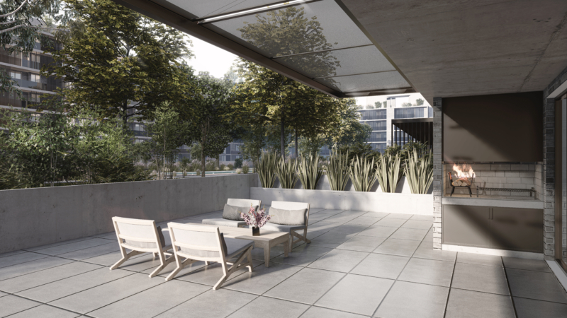 “El proyecto contempla unidades de uno, dos y tres dormitorios con patios y balcones de mayor profundidad y parrilleros individuales; uno de los requerimientos que se han hecho evidentes con la pandemia. Todas las unidades se vinculan con ascensores hasta el nivel de cocheras en subsuelo el cual también incluye espacios para bicicletas. Los patios privados se comunican directamente al espacio central funcionando como una “casa”, mientras que las terrazas exclusivas tienen acceso con ascensor.