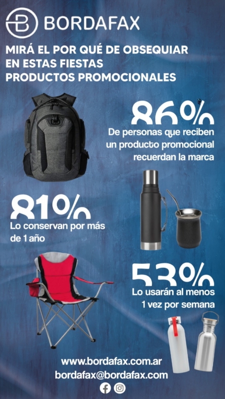 Según las estadísticas de la compañía, a nivel nacional, cerca de un tercio de las compras que se efectuaron fueron bolsos y mochilas, un producto muy de moda en la actualidad. El drinkware está en el segundo puesto con un 23%. Sin embargo, Bordafax tiene como producto número uno las gorras. «El año que más vendimos fue durante el boom de la soja donde alcanzamos el medio millón de gorras comercializadas. Este 2021 prácticamente no hubo ningún evento pero esperamos para los próximos años volver a ese volumen de gorras», señaló Camerano