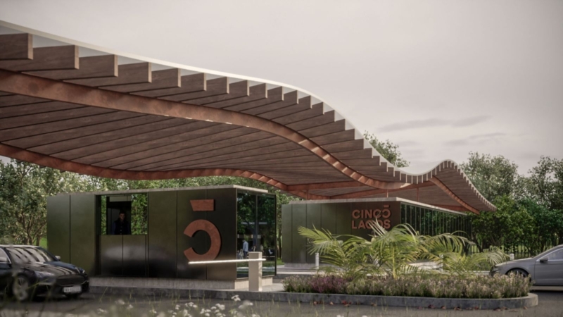 El ingreso principal deriva en ingresos secundarios ya automatizados a los diferentes barrios cerrados, cuyo diseño forma parte de la misma composición ideada por el estudio de arquitectos.