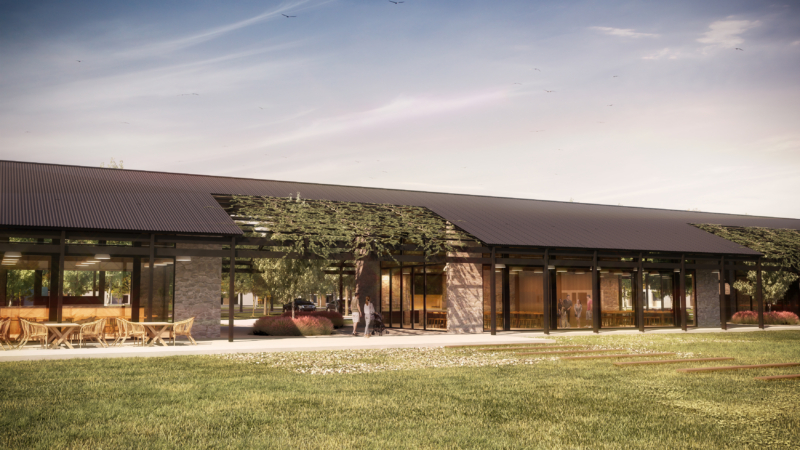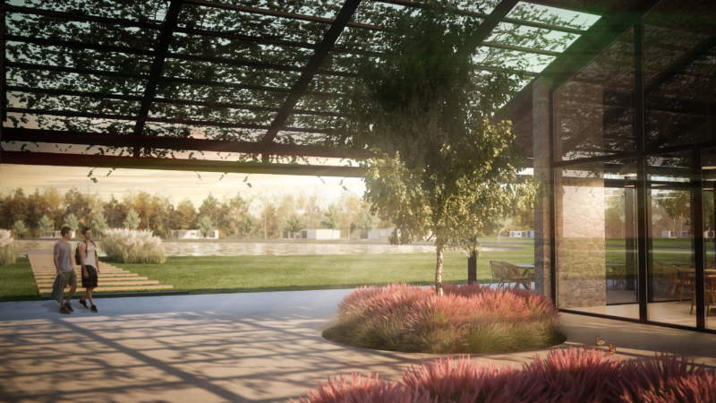 En los renders se puede apreciar el ingreso principal donde la piedra como materialidad tiene un peso predominante, tal el espíritu cuyano de La Finca I, con presencia de amplios espacios comunes verdes.