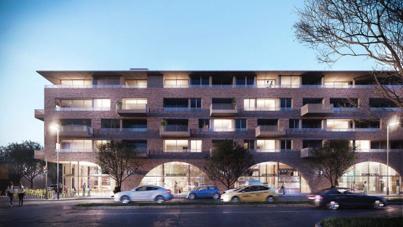 La expresión material rescata la identidad ladrillera y ferroviaria original del barrio. La planta baja se traduce en una sucesión de arcos que acompañan el recorrido peatonal sobre los locales comerciales y el ingreso al conjunto otorgando una fuerte personalidad al edificio.