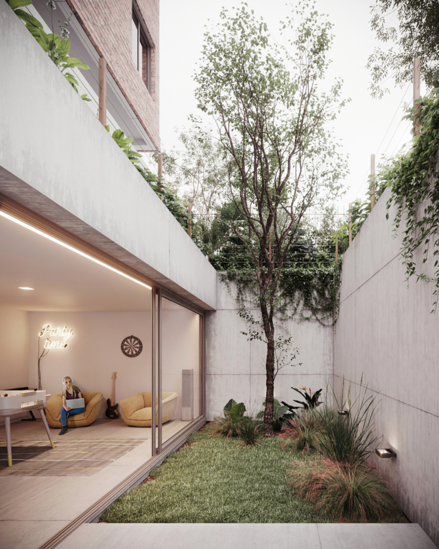 Con acceso directo al subsuelo, se encuentra una sala de juegos para niños y una sala de hobbies -como nueva incorporación en la variedad de espacios comunes-. Se trata de poder brindar a los habitantes un lugar propicio para realizar actividades tales como tocar instrumentos, manualidades o realizar alguna otra actividad complementaria. Estas dos salas cuentan con una expansión verde bajo nivel, también llamado “patio inglés”.