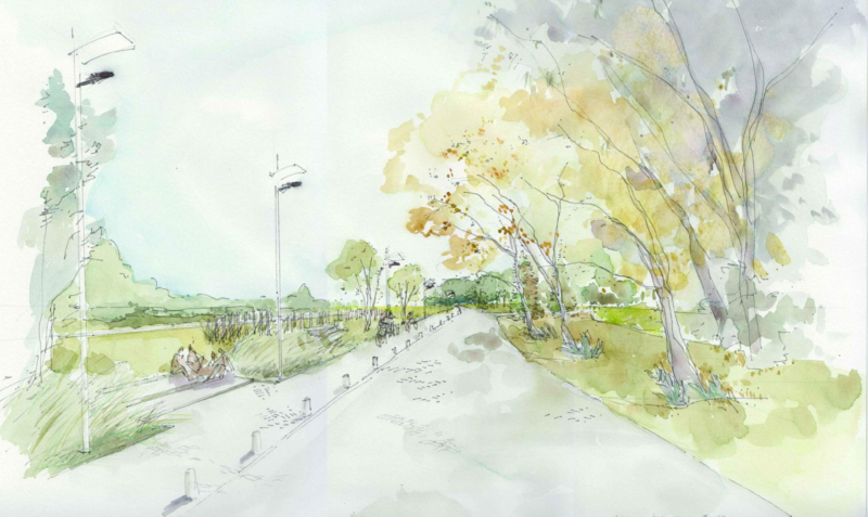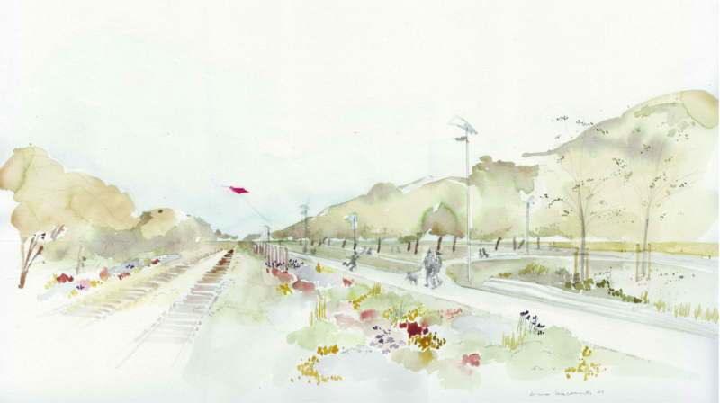La propuesta paisajística está basada en revitalizar la flora autóctona y generar circulaciones diferenciadas para caminantes, ciclistas, y espacios de estar, con equipamiento de bajo mantenimiento.
