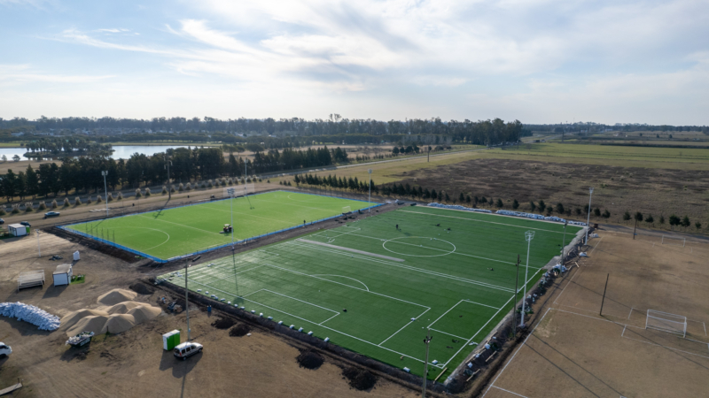 “La cancha de Hockey está prácticamente finalizada en un 90%. El campo del juego está perfectamente listo para usarse, con bancos, contención de pelotas, con medidas profesionales, iluminación led, solo faltan algunos detalles estéticos en el perímetro, accesos y forestación. Tiene medidas profesionales, por lo que se puede usar transversalmente con dos canchas en la metodología “Seven”, lo cual hace que tenga en los laterales 4 arcos más. Esta instalación ya se usa en las academias deportivas de Damfield, con nenes que van de 4 a 16 años, además de convenios con instituciones, como el Club Bancario, que la utiliza para entrenar varias veces en la semana.”
