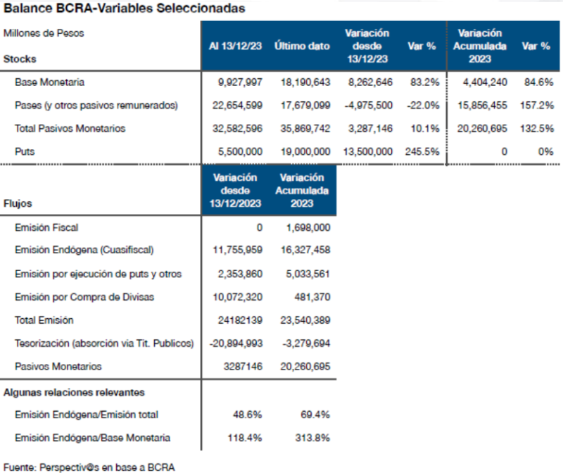 - No se modifica por el momento (se mencionó que se estarían explorando alternativas) la operatoria de los puts otorgados por el BCRA sobre títulos públicos en cartera de los bancos. Lo cual cuestiona en parte el anuncio de “emisión endógena” cero por razones monetarias, por cuanto toda vez que un banco ejerce el put, el BCRA está obligado a comprar el activo subyacente contra pesos (que emite). Dicha operatoria significó una expansión monetaria de 2.7 Billones desde que asumieron las actuales autoridades económicas y xx en los últimos 30 días.