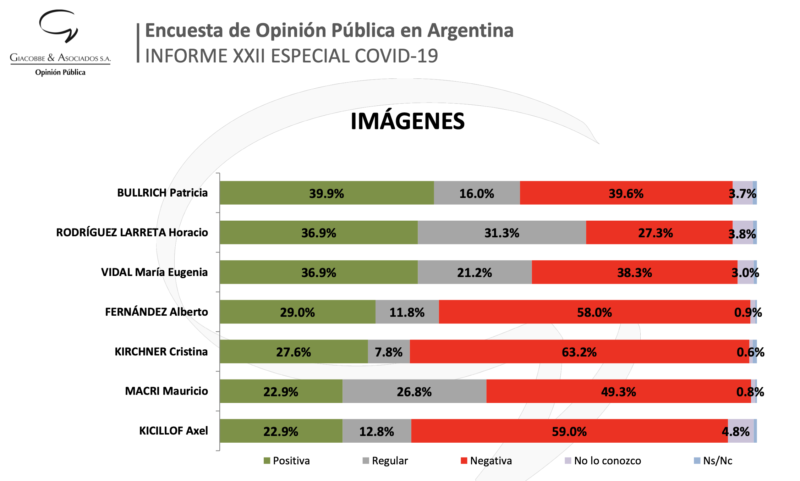 Por el lado del oficialismo, el presidente Alberto Fernández recuperó dos puntos de imagen positiva, mientras que Cristina Kirchner creció un punto y medio, y Axel Kicillof se mantuvo estable. Por la oposición, Patricia Bullrich, María Eugenia Vidal y Horacio Rodríguez Larreta resultan un tridente que oscila entre los 35 y 40 puntos de imagen positiva, con tres estrategias distintas y atributos de imagen disimiles. La parte de la sociedad que resulta opositora se debate entre sus diferentes estilos y, por lo pronto, los resguarda a todos.
