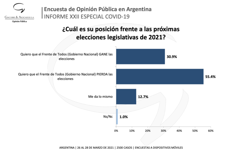 La posición “Quiero que el Frente de Todos gane las elecciones de 2021” creció un poco, al igual que su posición antagónica. Todo en detrimento de los “me da lo mismo”.