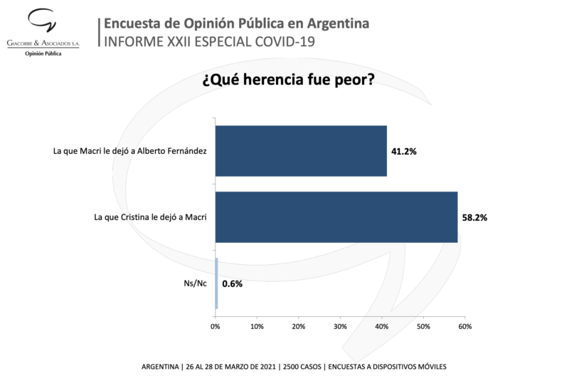 Visto y considerando que una buena parte de la campaña de 2021 y de 2023 circulará en torno al debate por “quien tiene la culpa”, hemos vuelto a medir la cuestión. En ese sentido el 58.2% de los encuestados creen que la herencia que Cristina le dejó a Macri es peor que la que Macri le dejó a Alberto Fernández (41.2%).