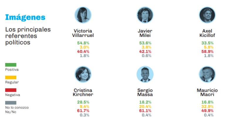 En lo que respecta a la imagen de distintos políticos, los datos muestran una variedad de percepciones. Victoria Villarruel cuenta con una imagen positiva del 54.8%, frente a un 40.4% de imagen negativa. Respecto a Javier Milei, el 53.6% de la población tiene una percepción positiva, mientras que el 42.1% la ve de manera negativa. Por su parte, Áxel Kicillof obtiene una imagen positiva del 33.5%, pero es contrarrestada por una imagen negativa del 58.9%. En cuanto a Cristina Kirchner, su imagen positiva es del 28.5%, frente a un 61.7% de imagen negativa. Sergio Massa cuenta con una imagen positiva del 18.2%, pero una negativa del 61.1%, con un 20.4% de percepción regular. Finalmente, Mauricio Macri presenta una imagen positiva del 16.8%, una negativa del 49.9% y un 32.9% de percepción regular.