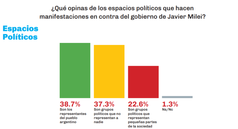 En relación con las manifestaciones en contra del gobierno de Javier Milei, las opiniones están divididas. Un 38.7% considera que son los representantes del pueblo, mientras que un 37.3% opina que son grupos políticos que no representan a nadie. Por otro lado, un 22.6% los identifica como grupos políticos que representan pequeñas partes de la sociedad.