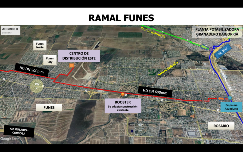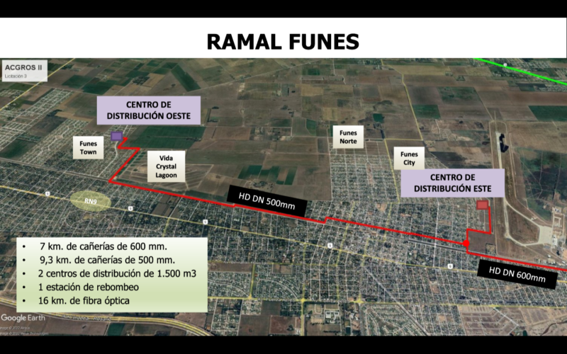 El Ramal Funes tiene su origen en el Acueducto Empalme de Rosario y llegará a la ciudad paralelo a la Ruta 9. Serán 7 kilómetros de cañerías de 600 mm, 9,3 kilómetros de cañerías de 500 mm, dos centros de distribución con 1500 cm3 de capacidad (uno en Funes Town y otro de frente al Aeropuerto), 1 estación de rebombeo y más de 16 kilómetros de fibra óptica.