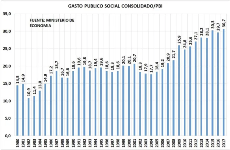 Si miramos el gasto público social consolidado, incluyendo salud, educación, pensiones, cultura, ciencia y técnica y demás rubros, nos vamos a encontrar con que en 1980 ese gasto representaba el 15% del PBI y en 2017 (último dato disponible del Ministerio de Economía) representaba el 30% del PBI. Es decir, se duplicó el gasto social y cada vez tenemos más pobres, indigentes, desocupados, peores hospitales y educación.