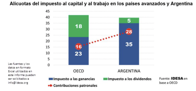 Una evaluación objetiva se puede trazar comparando la presión tributaria en los países desarrollados, tanto la aplicada al capital (impuesto a las ganancias) como al trabajo (contribuciones patronales), con la de Argentina. Según datos de la OECD se observa que:
